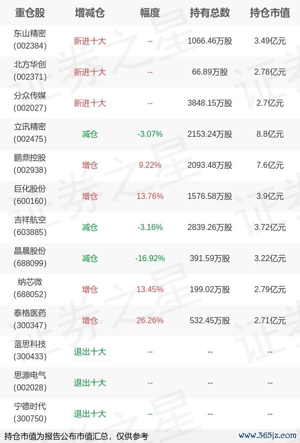 本站消息,4月22日兴证全球基金旗下乔迁管理的兴全新视野灵活配置定期开放混合型发起式基金公布一季报,近1年净值增长率10.37%。与上一季度相比,该基金前十大重仓股新增东山精密,北方华创云资管,分众传媒;其中立讯精密持仓占比9.71%,为该基金第一大重仓股;蓝思科技,思源电气,宁德时代等退出前十大重仓股;详细数据如下: